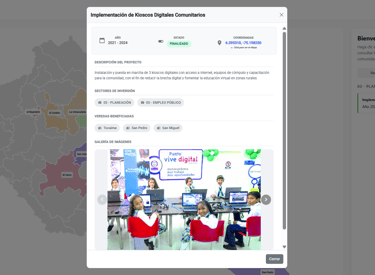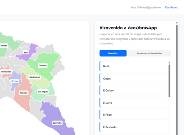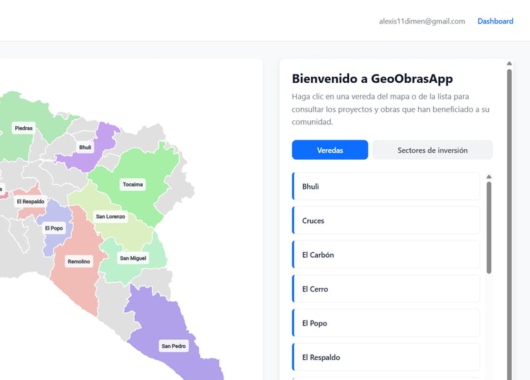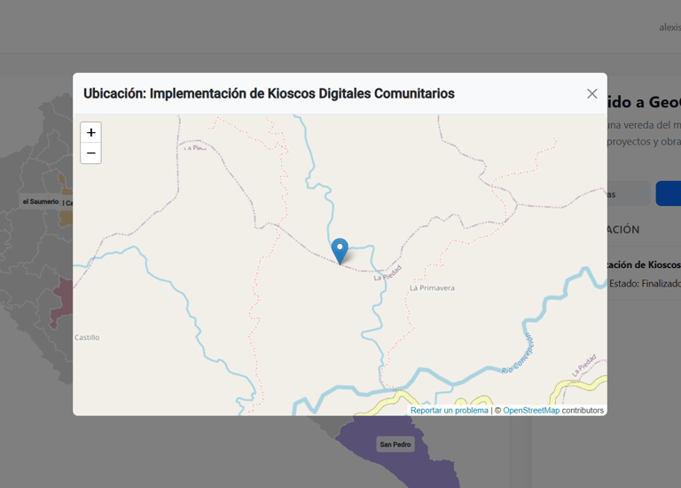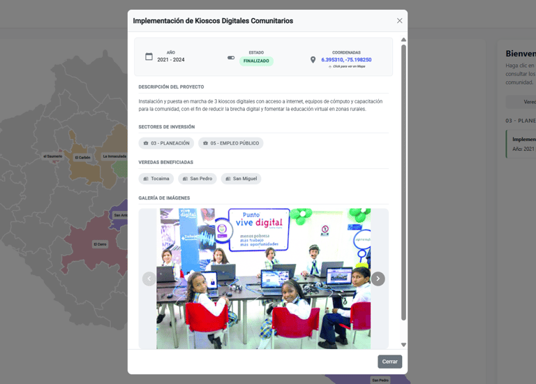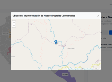 Visualización Georreferenciada: Todos los proyectos se muestran en un mapa interactivo, permitiendo a los usuarios ubicar fácilmente las obras por vereda, barrio o sector.